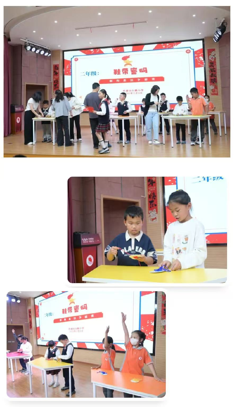 “交叉、打结、拉紧!”小选手十指翻飞,鞋带在他们手中穿梭。瞧,同学们手法娴熟地系出了一个个牢固美观的蝴蝶结鞋带,展现着自己对细节的把握。