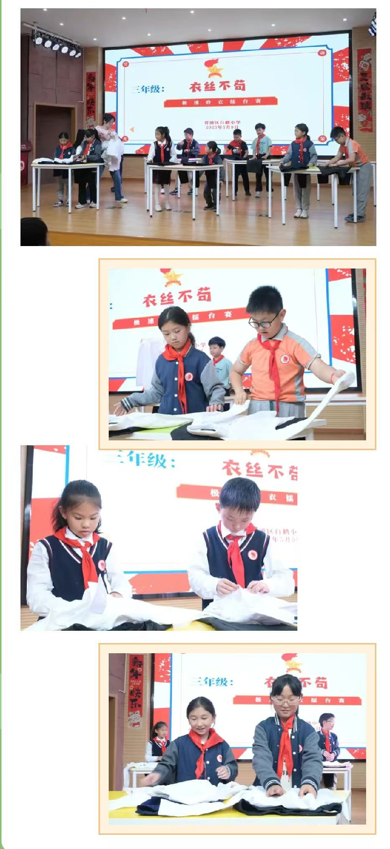 随着裁判一声令下,孩子们迅速拿起给定的衬衫和裤子,抖衣、扣纽扣、对折、压痕……手指翻飞间,衣物便被叠得整整齐齐、有棱有角,尽显生活小能手风范。