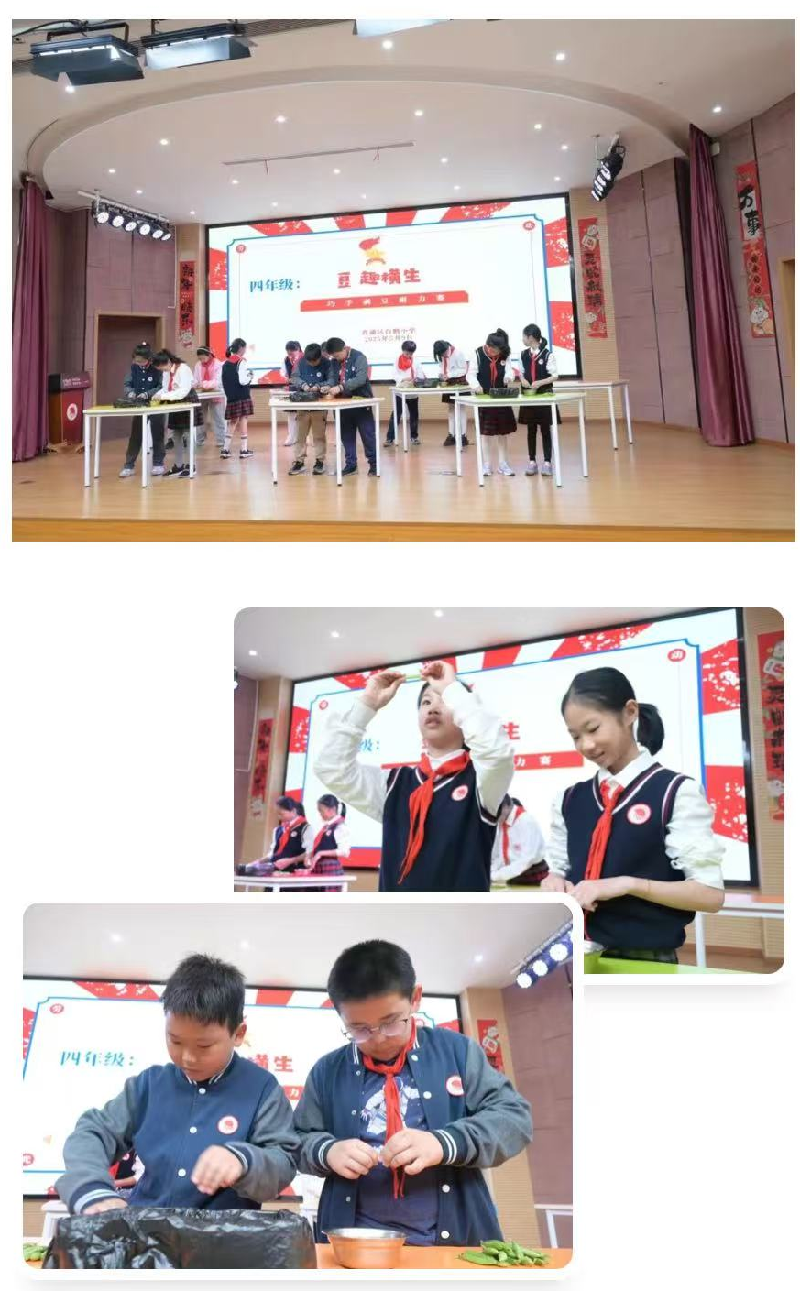 剥豆考验学生的耐心与细致。听,“咔嚓”声清脆悦耳,豆荚应声而开。小选手屏息凝神,指尖轻挑,不一会儿,便剥出了一颗颗饱满干净的豆子。