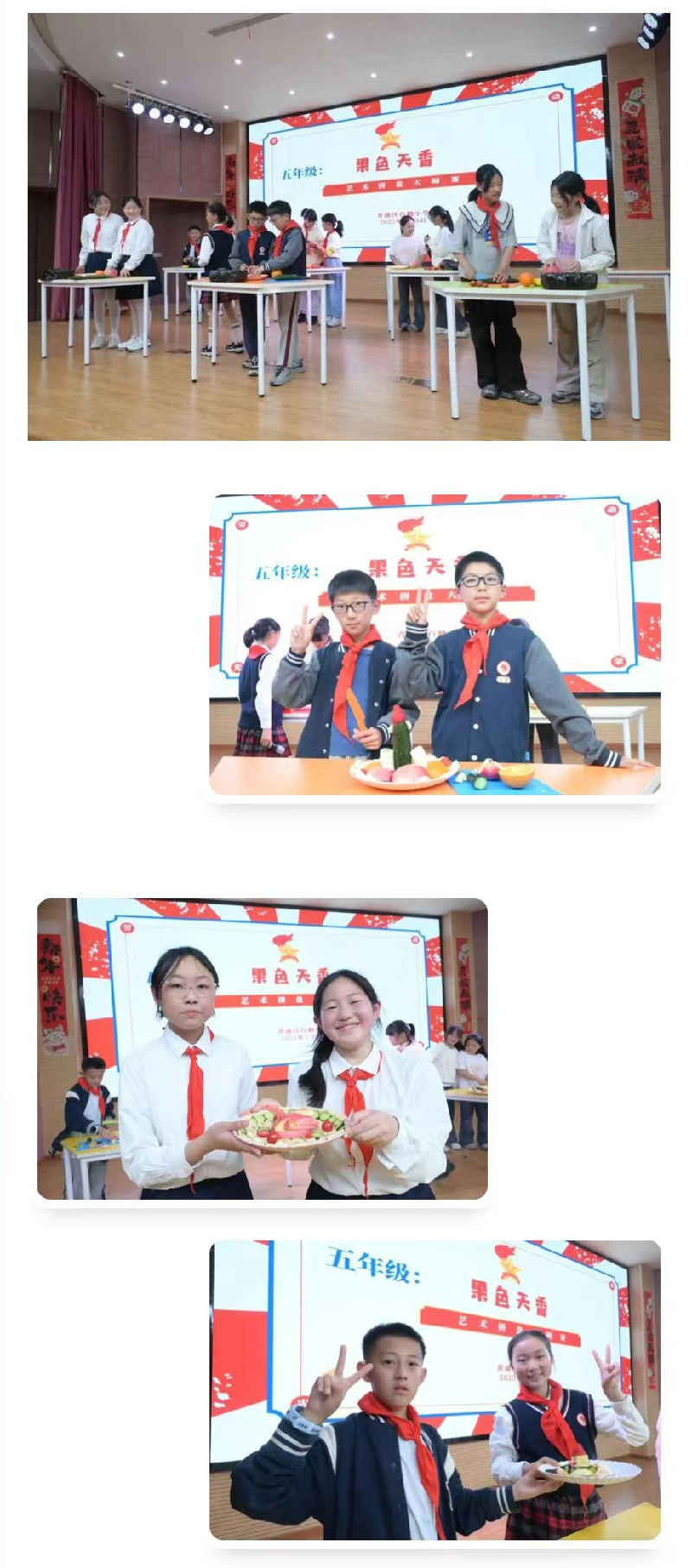 五年级的孩子们发挥奇思妙想,利用苹果、香蕉、橙子、草莓等水果,制作出一个个造型美观、创意十足、色彩搭配和谐的水果拼盘,让人眼前一亮。“舌尖美学”与“劳动智慧”碰撞,引得评委连连拍照。