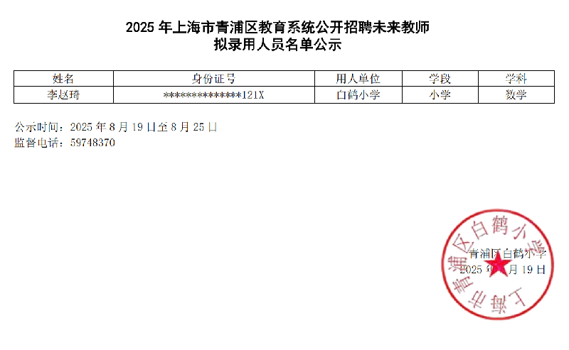 2025年上海市青浦区教育系统公开招聘未来教师 拟录用人员名单公示